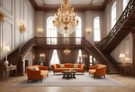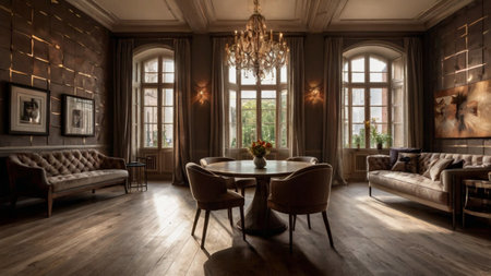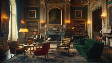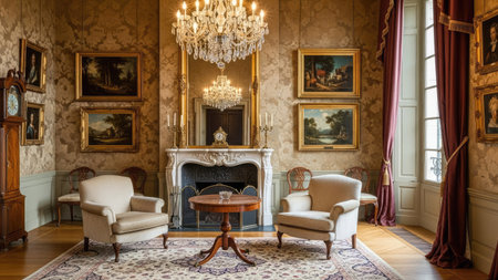 An opulent room features classic furnishings including armchairs, a table, and a grand chandelier. The walls are adorned with framed artwork. Soft lighting illuminates the space. Suitable for editorial use, the image is versatile for illustrating luxury and design.