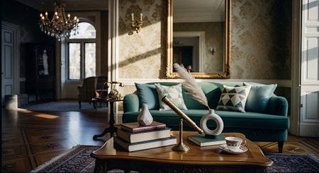 Luxury interior of the living room in classic style. Sofa, coffee cup, books and a telescope.