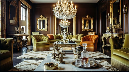 rich apartment interior with golden baroque decorations on the walls and luxury furniture. the room is flooded with the rays of the setting sun