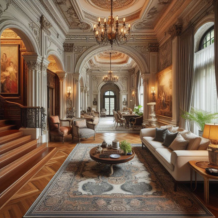 This image showcases the interior of a grand and opulent mansion,featuring a stunning hallway with intricate architectural details,including a magnificent staircase,ornate wood paneling,and a