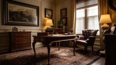 Interior design of Home Office in Traditional style with Antique Desk decorated with Leather Chair, Oriental Rug material. Colonial architecture. Generative AI AIG24.