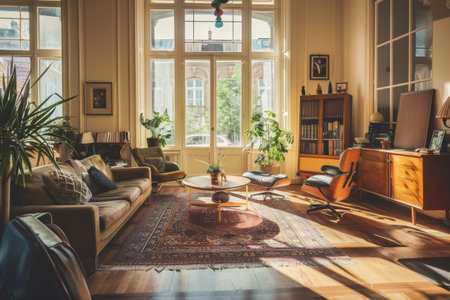 Sunlight streams through large windows, illuminating a cozy living room filled with plants and vintage furniture, creating a serene and inviting atmosphere.