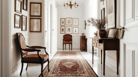 A classic hallway with vintage furniture, an ornate rug, and gallery-style framed photos on the wall.