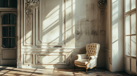 An AI generated illustration of a sunlit room with vintage white chair and a doorway
