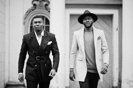 Two fashion black men walking on street. Fashionable portrait of african american male models. Wear suit, coat and hat.