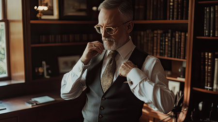 An elegant older gentleman in a dapper suit adjusts his vest in a sophisticated home office. The warm light and rich bookshelves create a cozy atmosphere.