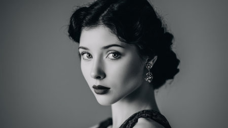 This striking black and white portrait features an elegant woman with vintage fashion elements, highlighting beauty and drama in expression.