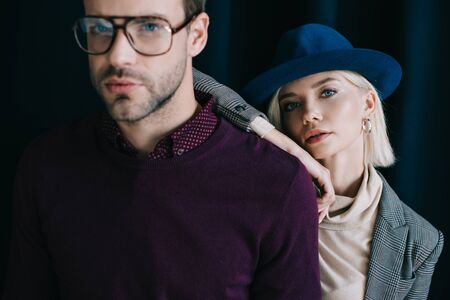 stylish young man in glasses and blonde woman in hat looking at camera near curtain