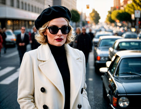 photo of middle aged woman with white turtleneck and coat and beret standing in front of busy crowd crosswalk street , generative AI