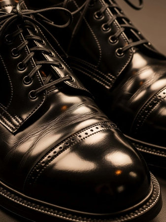 Close up of a pair of black leather shoes. Shallow depth of field.