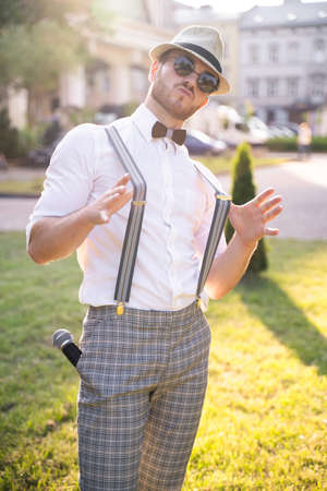 handsome presenter and showman in a stylish suit and hat with a microphone poses with the best emotions and acrobatic tricks