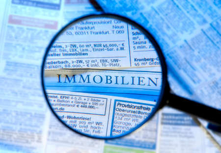 Magnifier focused real estate ads and the word Immobilien