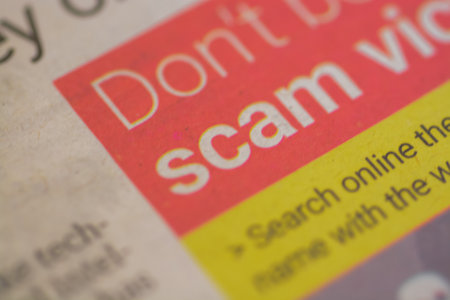 A close-up view of the wording Scam prominently displayed on a newspaper