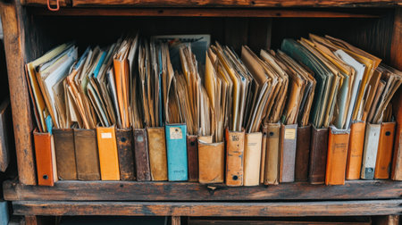 A selective focus shot capturing a stack of colorful paper files on a wooden desk, with a soft blur on the background enhancing the details in the foreground.