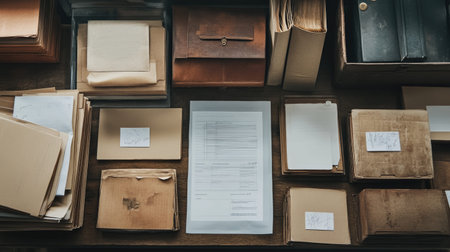A detailed aerial view of an organized workspace showcasing various documents and files in shades of brown and white, ideal for business and office themes.