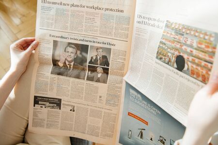 PARIS, FRANCE - APR 24, 2017: Emmanuel Macron on newspaper article - woman reading the UK Financial Times newspaper a day after the first round of the French Presidential election on April 24, 2017