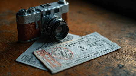 Vintage camera and ticket on old wooden table. Shallow depth of field