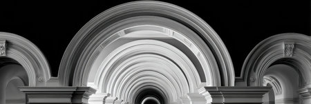 A series of symmetricalart.ches and curved lines adding depth and dimension to a monochromatic structure. Black and white art.