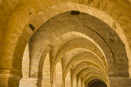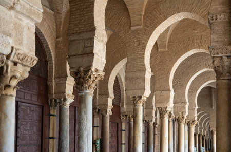 Long corridors under vaulted ceiling in ancient mosque of Kairouan in Tunisia.