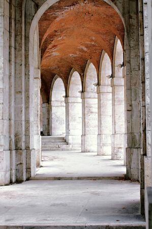 Corridor Colonnade Arcade Perspective Architectural Background. Arched Vaults in Architecture.Building Exterior at Sunset
