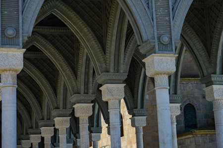 lose-up of historic classic stone arch showing detailed ribbed vault construction with weathered texture. Repeating curves emphasize Gothic architectural symmetry and craftsmanship