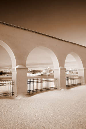 Arches on the seashore, retro monument in Sochi, Russia. Beautiful sea view before sunset, minimalistic landscape