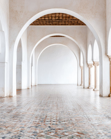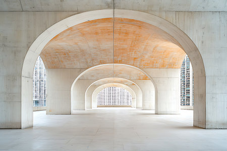 Arched corridor in a minimalist architectural style, the corridor is composed of a series of.