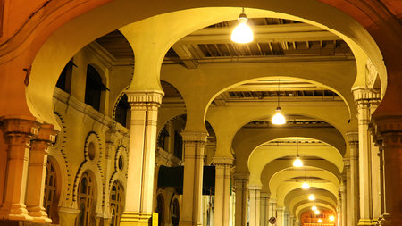 Long exterior portico of old Melbourne General Post Office Building with row of repeating illuminated arches diminishing along the building.