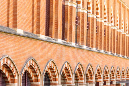 Red brick arches on an old wall, architectural detail. Historic building and design concept