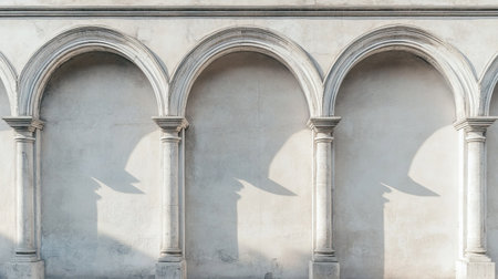 A low-angle perspective of a row of ornate, carved stone arches on the facade of a classical or Romanesque-style building. Strong sunlight creates deep shadows, highlighting the architectural details and textures. The image represents history, architecture, and timeless design.