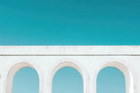 Serene architectural arches under a clear turquoise sky, creating a minimalist aesthetic with a fresh and calming vibe for design projects and backgrounds