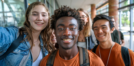 A group of happy students stands closely together their smiling faces brightening the school corridor during a busy day.
