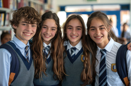 group of 4 smiling teenage students wearing uniform standing in classroom. ai generated