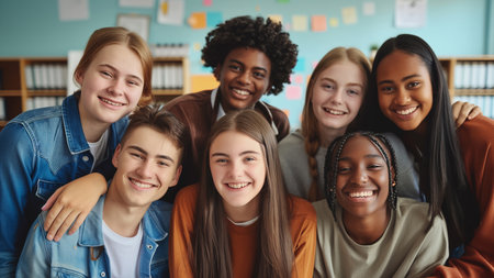 A diverse group of smiling teenagers posing together in a classroom, showing unity and friendship in an educational setting.