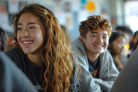 toothy smile of a boy and girl high school student chatting with friends while studying a group