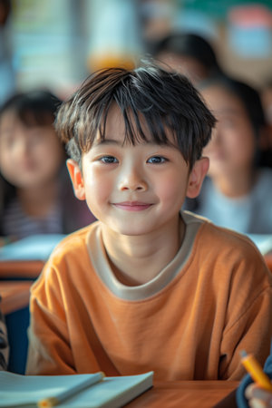 Portrait of smiling schoolchildren looking at camera while standing in classroom