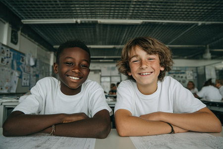 Diverse classroom for students. Middle school students studying together in a classroom, education concept for diverse students. Black and white boy sitting together at a desk.