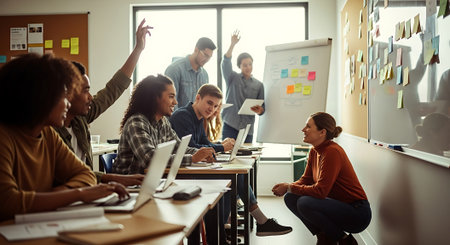 Group of students studying together in a classroom. Education and technology concept.