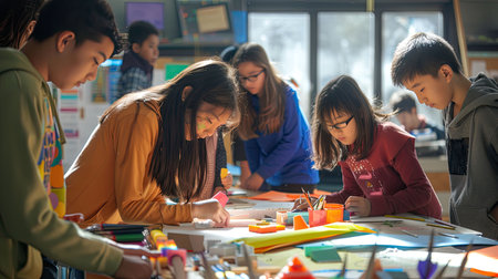 A group of diverse students working on a project together in a modern classroom