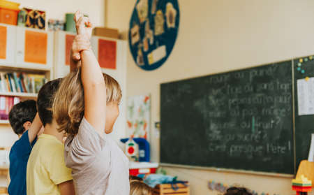 Multiethnic schoolchildren learn to raise their hands during a lesson in the classroom