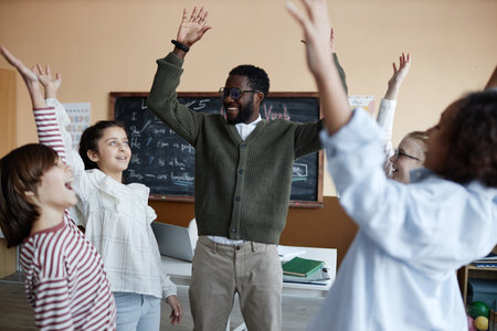 Young African American teacher and group of kids raising arms while having fun during lesson in classroom