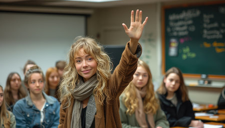 A young woman with blonde, curly hair, wearing a brown jacket and a grey scarf, raises her hand in a classroom setting.