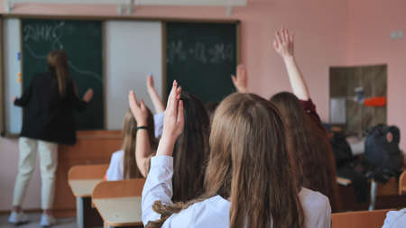 Students raising their hands while sitting on their desk in the class at school. school and education concept. By generative Ai