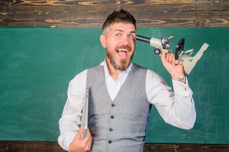 Happy bearded man in science class. E-learning, technology. Scientific, research concept. Biology or chemistry science. Back to school. Positive teacher with laptop and microscope. University student.