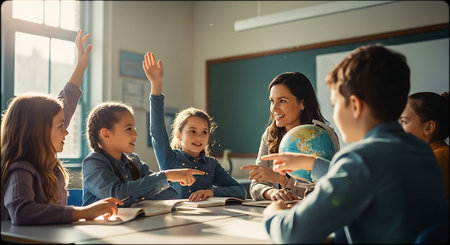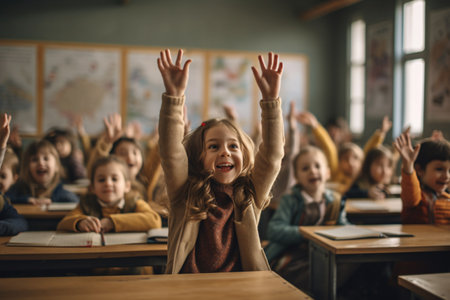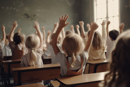 School classroom with kids raising their hands, generative ai