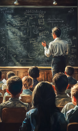 A nostalgic classroom scene featuring wooden desks, blackboards, vintage decor, and natural light, perfect for evoking memories of traditional education and learning spaces.