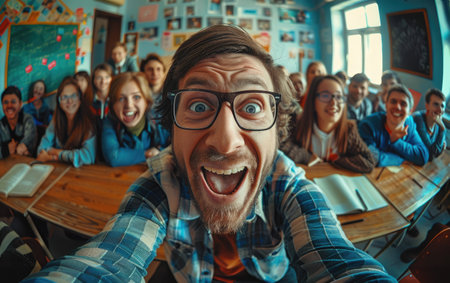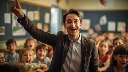Positivity And Engagement: Male Teacher Radiates Joy In Elementary School Classroom