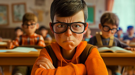An angry nerdy kid talking in class.