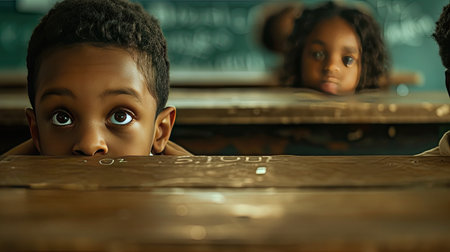 African american elementary schoolboy peeking on classmate's answer during test in primary school, sitting in classroom. AI Generated.