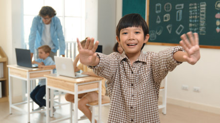 Asian boy looking at camera while waving hands and standing at blackboard. Skilled child greeting while diverse student study or learning about coding engineering prompt and generated AI. Pedagogy.
